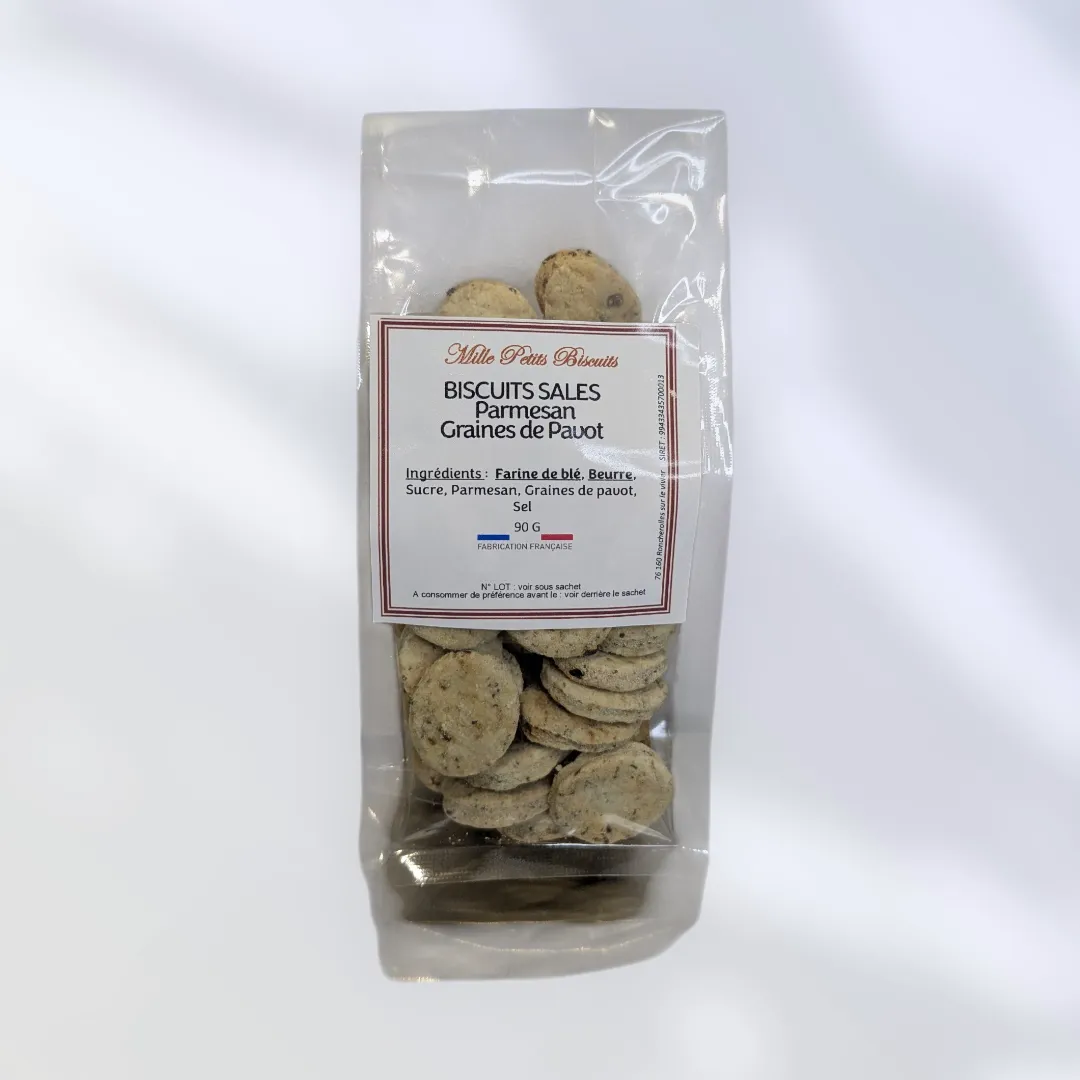 Biscuit apéritif artisanal en sachet de 100g, disponible en trois saveurs gourmandes : parmesan & graines de pavot, tomate & origan ou ail & fines herbes. Assortiment possible pour varier les plaisirs.