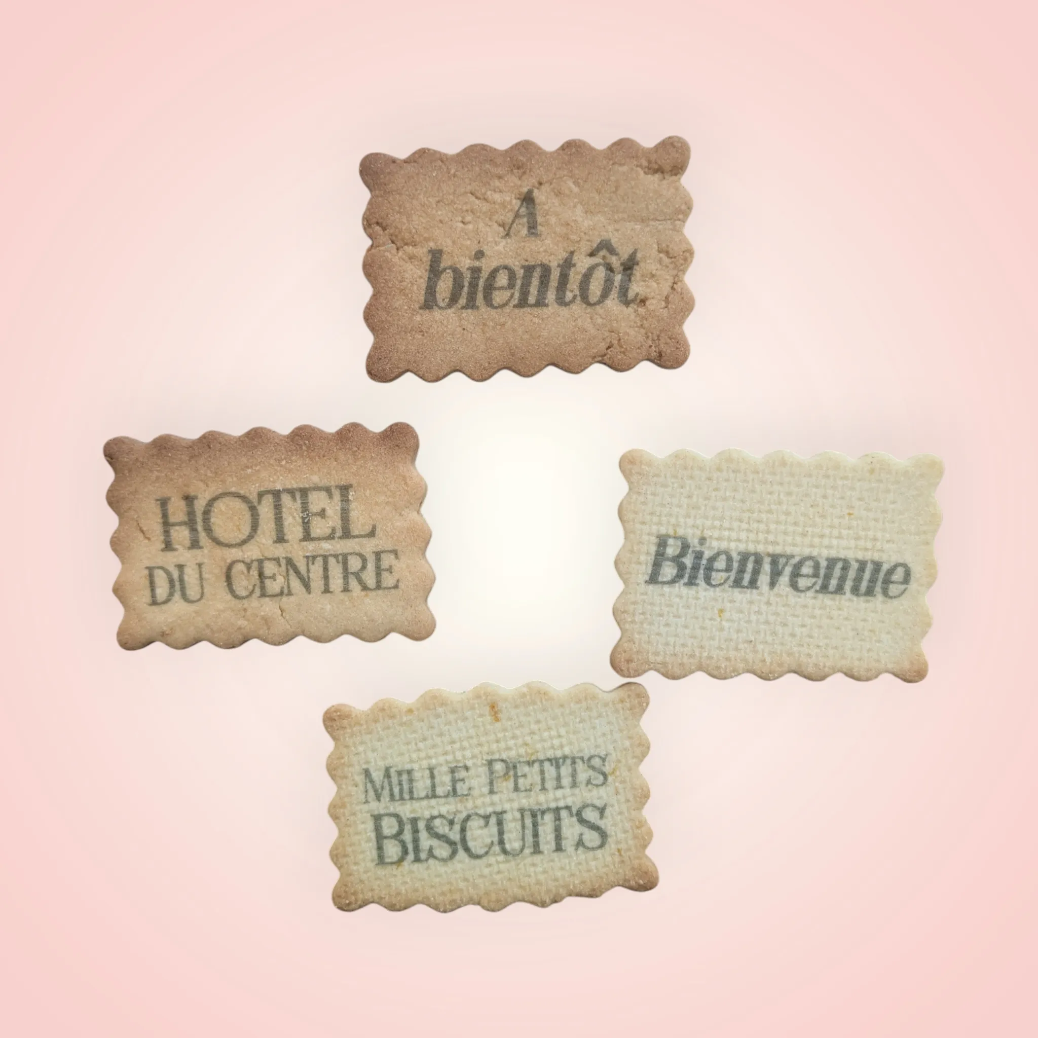 Biscuit artisanal forme petit beurre dentelé, disponible en plusieurs saveurs gourmandes. Sachet de 200g. Personnalisation du premier biscuit avec message imprimé. Existe aussi en sachet de 3 biscuits pour cadeau invité.