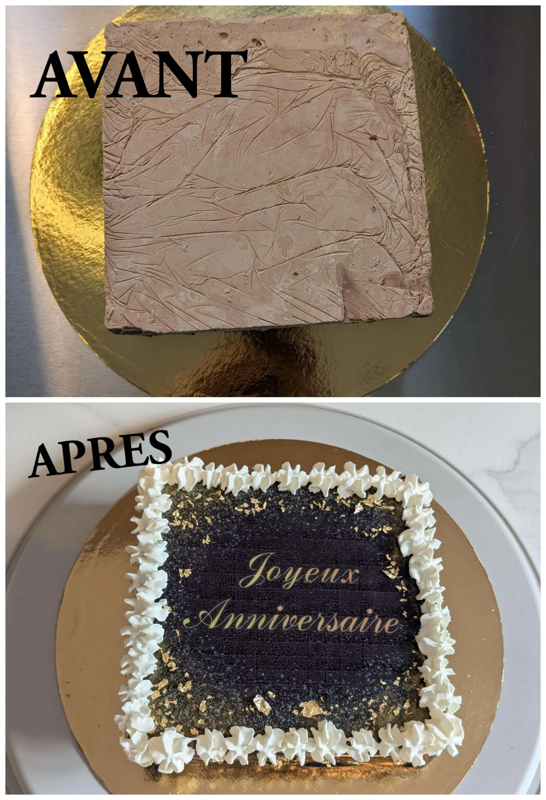Téléchargez votre visuel directement en ligne, choisissez le format souhaité et nous nous occupons de l’impression. Vous recevez une feuille comestible prête à poser sur pâte à sucre, crème au beurre, ganache ou chantilly (selon support compatible).